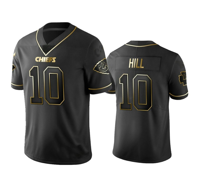 Every fan has various pieces of fan apparel that are a little different from the standard clothing that makes up most of their wardrobe or collection, and this Men Kansas City Chiefs #10 Golden Edition Vapor Untouchable Limited Tyreek Hill Black Jersey will definitely stand out from the others. The Gold Vapor Untouchable Limited jersey design includes a golden team graphics screen-printed on the front and on both sleeves, the golden player's name and number on the the front and back.