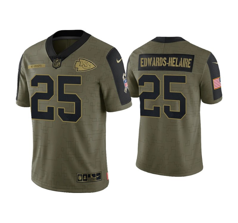 Cheer for the Kansas City Chiefs with this Men Kansas City Chiefs #25 Clyde Edwards-Helaire Olive 2021 Salute To Service Limited Jersey from Nike! It features amazing team and player graphics that are sure to help you show your team pride on game day. Your purchase of Salute to Service products will help the NFL's non-profit partners - the Pat Tillman Foundation, USO and Wounded Warrior Project - as they continue their important work to support our current and former military and their families.