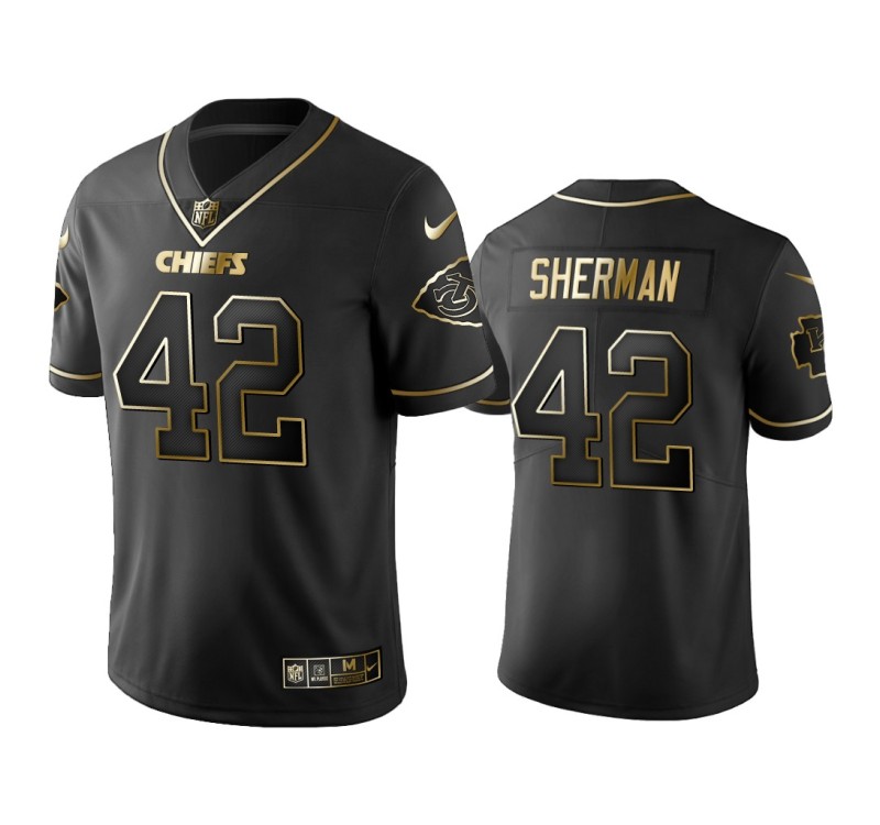 Every fan has various pieces of fan apparel that are a little different from the standard clothing that makes up most of their wardrobe or collection, and this Men Kansas City Chiefs #42 Golden Edition Vapor Untouchable Limited Anthony Sherman Black Jersey will definitely stand out from the others. The Gold Vapor Untouchable Limited jersey design includes a golden team graphics screen-printed on the front and on both sleeves, the golden player's name and number on the the front and back.