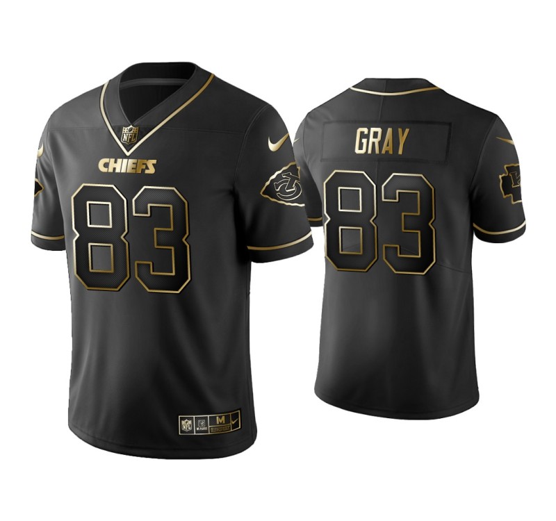 Every fan has various pieces of fan apparel that are a little different from the standard clothing that makes up most of their wardrobe or collection, and this Men Kansas City Chiefs #83 Golden Edition Vapor Limited Noah Gray Black Jersey will definitely stand out from the others. The Gold Vapor Untouchable Limited jersey design includes a golden team graphics screen-printed on the front and on both sleeves, the golden player's name and number on the the front and back.